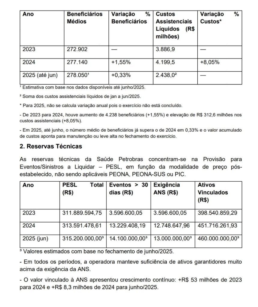 de 2025 da Saúde Petrobras, abrangendo evolução de beneficiários, custos